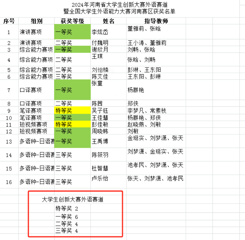 近日,河南省教育厅办公室公布了2024年河南省老员工创新大赛外语赛道暨全国老员工外语能力大赛河南赛区的获奖名单。公司在各类赛道共获得16项奖项。其中,特等奖 2 项,一等奖 6 项,二等奖4项,三等奖4项。