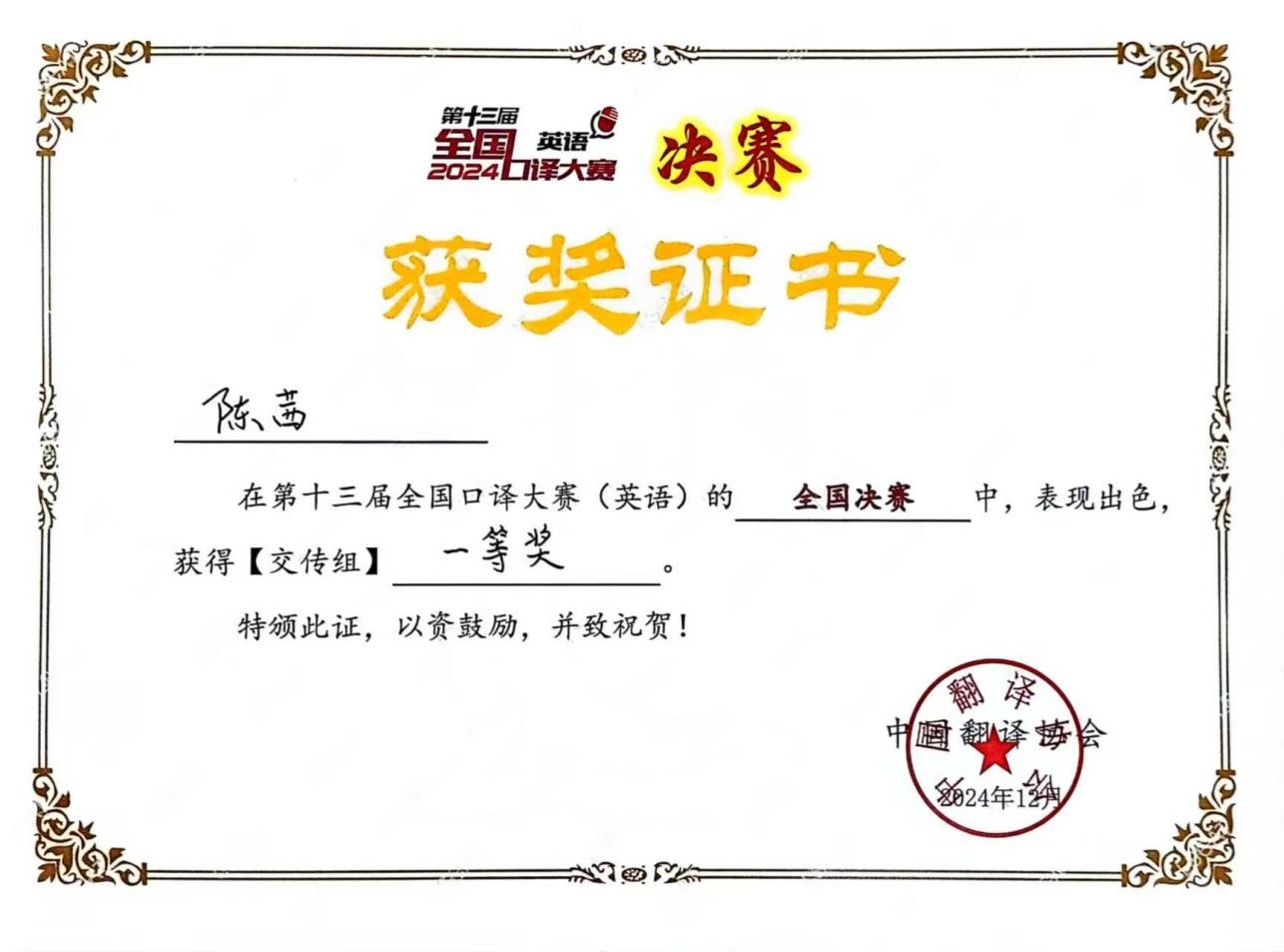在2024年12月28日至29日,第十三届全国口译大赛(英语)决赛中,公司英国365集团官网翻译专业22-1班员工陈茜凭借扎实的专业基础,出色的翻译能力,取得了优异的成绩,获交替传译组一等奖,展现了英国365集团官网学子的风采和实力,为公司赢得了荣誉。