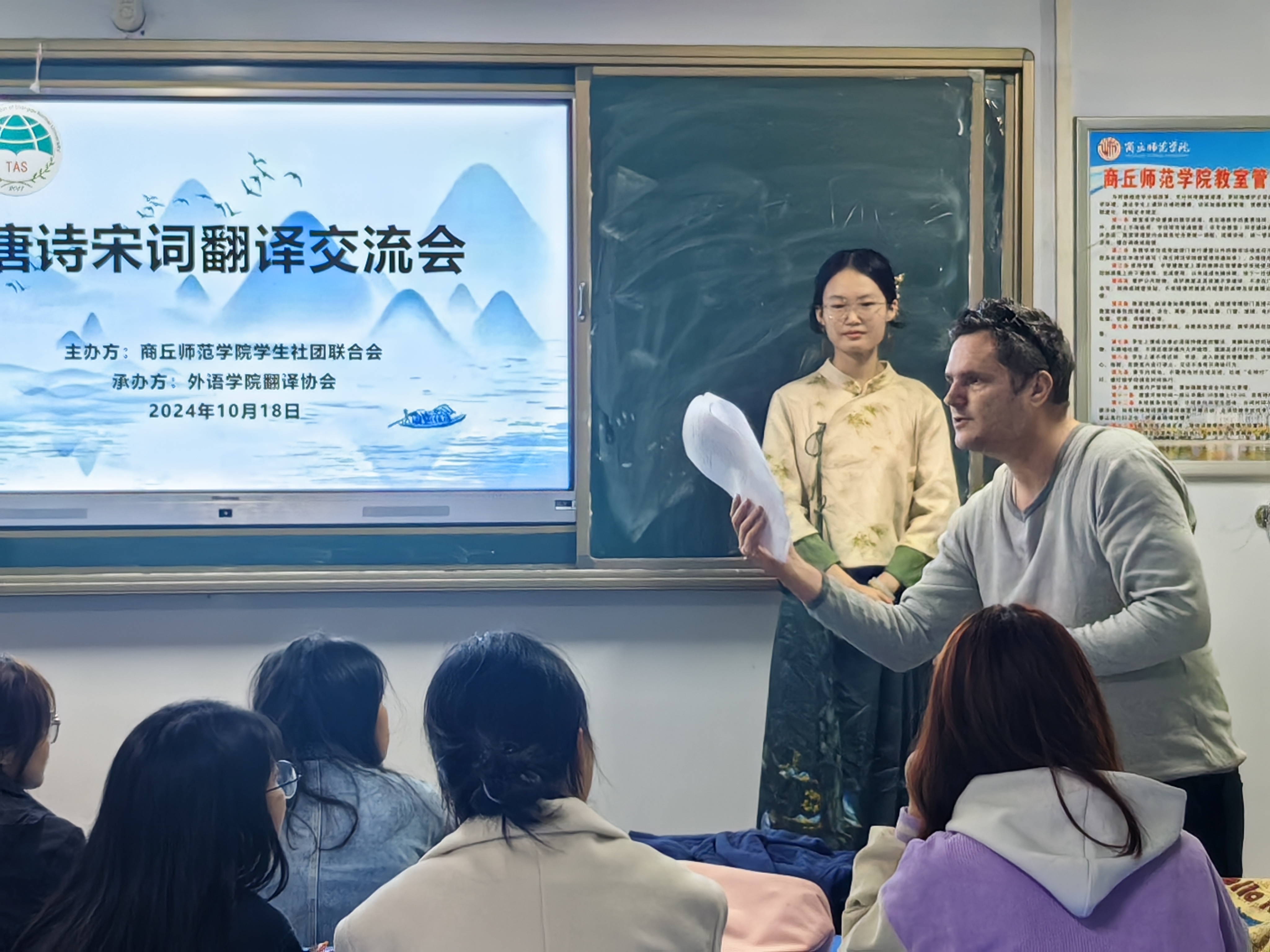 为弘扬中华优秀传统文化,加深对唐诗宋词和翻译艺术的理解,培养员工跨文化交流的意识和能力,英国365集团官网翻译协会于2024年10月18日晚在智圆楼122教室举办了唐诗宋词翻译交流会。