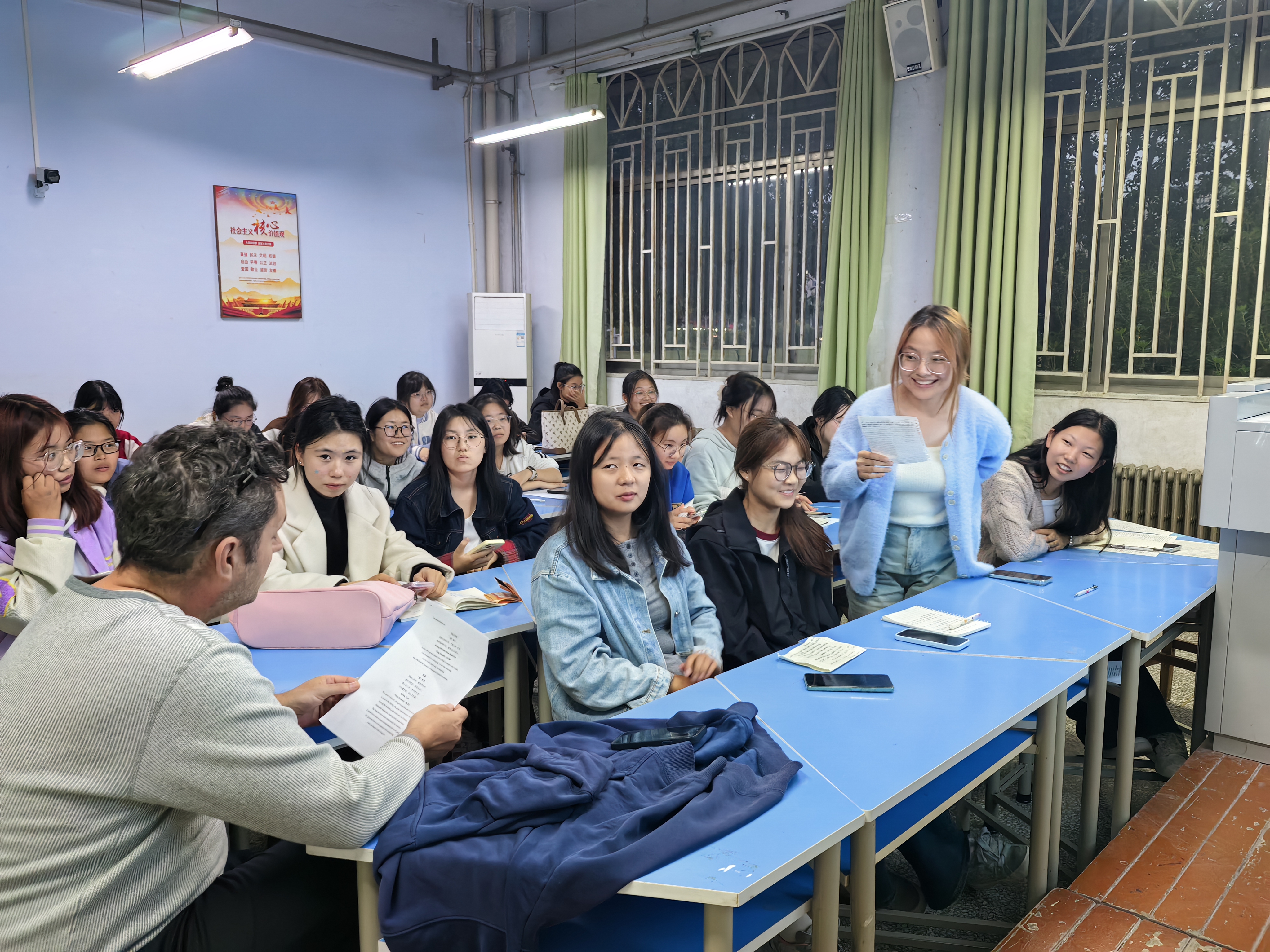 此次交流会邀请到了外籍教师Mark担任现场指导,活动内容是同学们根据自己的理解分别将两首唐诗和两首宋词翻译成英文,并进行现场展示和分享交流,体会每一种语言带来的韵律美和意境美。活动现场气氛热烈,同学们纷纷分享自己在翻译过程中的感受与体会,有的从文化差异的角度出发,阐述如何在翻译中准确传达诗词的意境;有的则通过具体的案例分析,展示了不同翻译方法所带来的不同效果。大家精彩的发言赢得了现场阵阵掌声,也启发了对于文化传承的思考和共鸣。