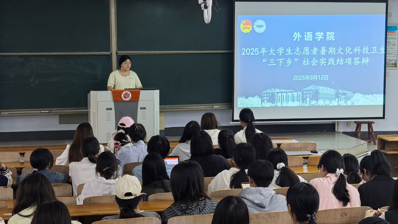 答辩会上,各团队负责人通过PPT展示,从实践内容、成果成效、创新特色等多个维度,对实践项目进行了全面详细汇报。从双语宣传非物质文化遗产到加快生态文明建设,从关爱银发老人到多语种宣讲红色精神,从提升乡村小学英语课堂趣味性到纠正景区标语翻译错误,外院学子将课堂所学与社会实践相结合,用扎实的行动展现专业担当与青春风采。