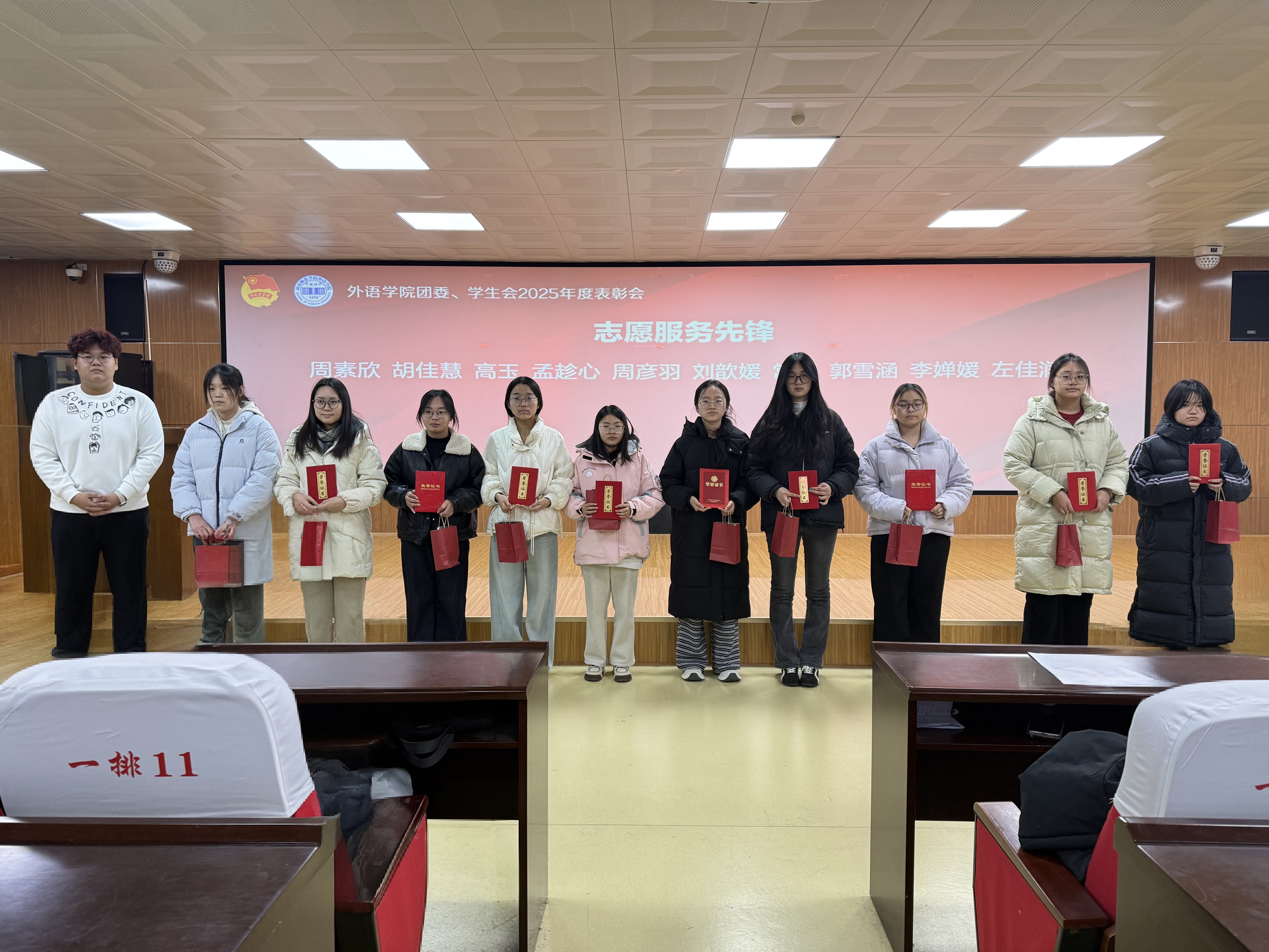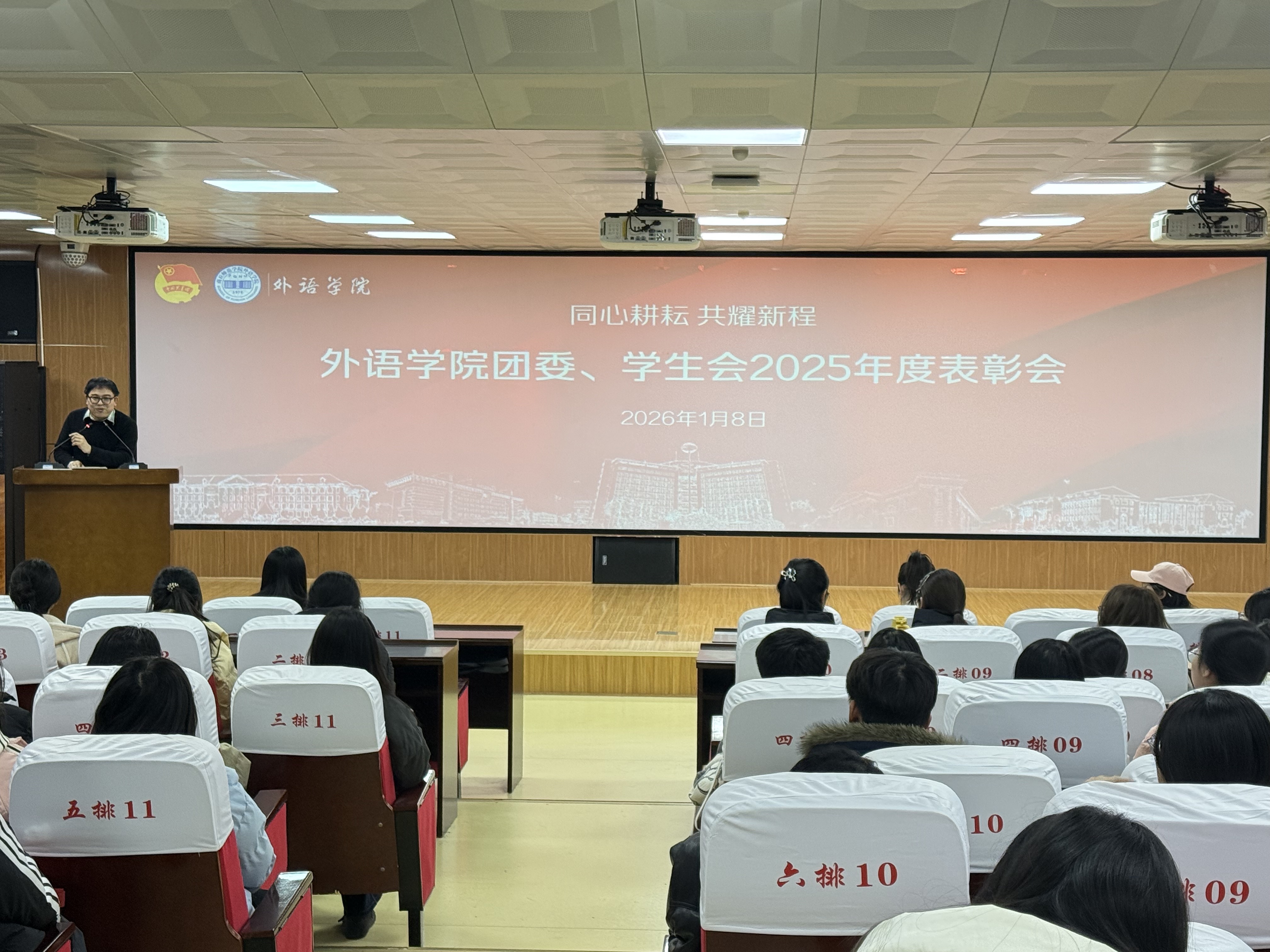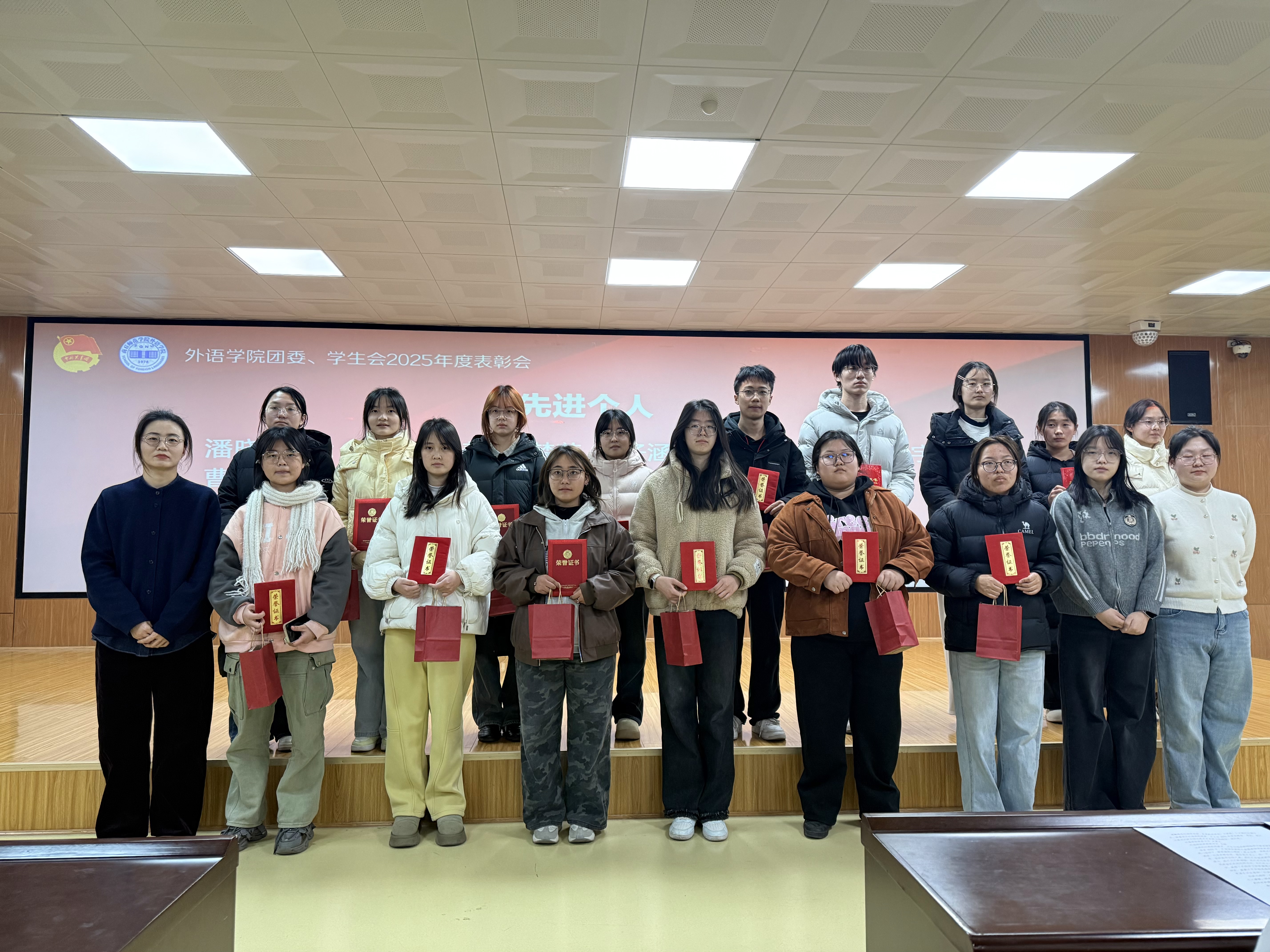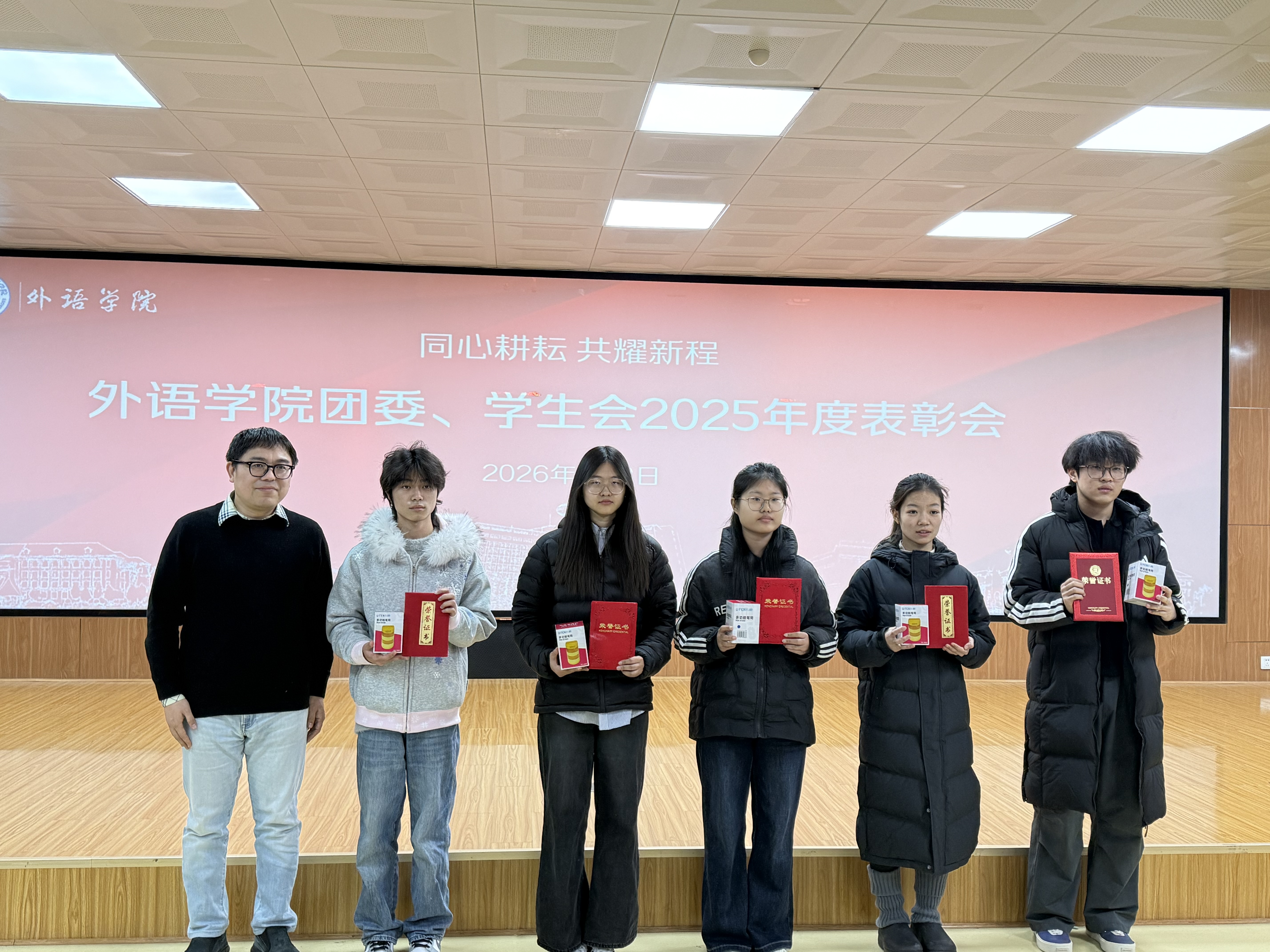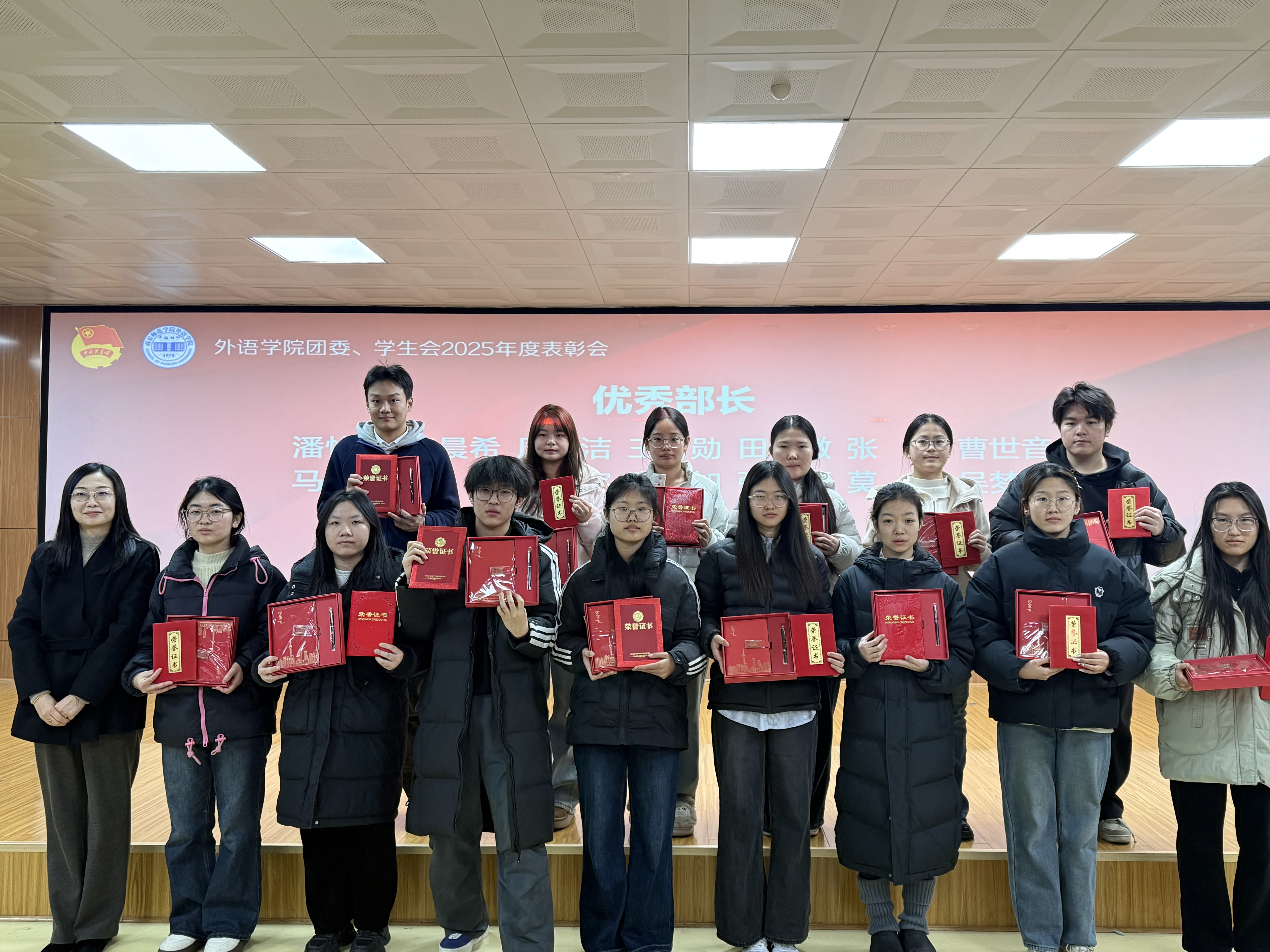 表彰会现场洋溢着青春的蓬勃朝气与昂扬向上的热烈氛围。会上依次颁发了“优秀部门”“优秀部长”“先进个人”“志愿服务先锋”四个奖项,对过去一年在组织建设、活动开展、服务同学、社会实践等方面表现突出的集体与个人进行了表彰。颁奖结束后,朱震杰作总结讲话,他首先代表公司党委向受到表彰的集体和个人表示热烈祝贺,并对团委、员工会一年来的辛勤工作和取得的各项成绩给予了充分肯定,并指出公司团学组织紧紧围绕立德树人根本任务,在思想引领、学风建设、文化育人、志愿服务等方面发挥了重要作用,为公司发展贡献了青春力量,也展现出了外院学子锐意进取、甘于奉献的良好精神风貌。最后,朱震杰对全体成员提出殷切期望:一是要继续坚定理想信念,听党话、跟党走,勇担时代使命;二是要夯实组织基础,增强服务意识,切实发挥桥梁纽带作用;三是要勇于创新实践,提升综合素质,打造具有外语特色的品牌活动。希望大家以此次表彰会为新的起点,珍惜荣誉、再接再厉,为服务公司发展大局、推动团学工作再上新台阶作出更大贡献。