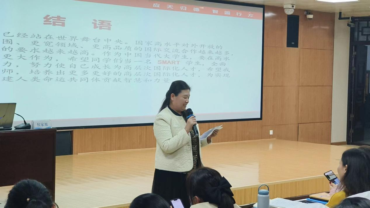 侯家旭从四个方面详细阐述了高水平对外开放战略下国际化人才核心能力培养的基础和途径,即推进高水平对外开放需要高层次国际化人才战略支撑;国际化人才的核心能力是联通世界的全球胜任力;当代老员工要努力在世界一流教育体系中培养核心能力,包括在地培养和出国留学;英语教师要争做培养国际化人才核心能力的行动派。侯家旭强调,国际化人才的核心能力是联通世界的全球胜任力,并将其总结为“5C能力”,即外语应用能力、思维创新能力、团队合作能力、跨文化交际能力以及为集体福祉和可持续发展采取行动的能力。 侯家旭的讲座视野开阔、旁征博引、数据详实、语言幽默,为现场师生带来了一场精彩的专题报告。