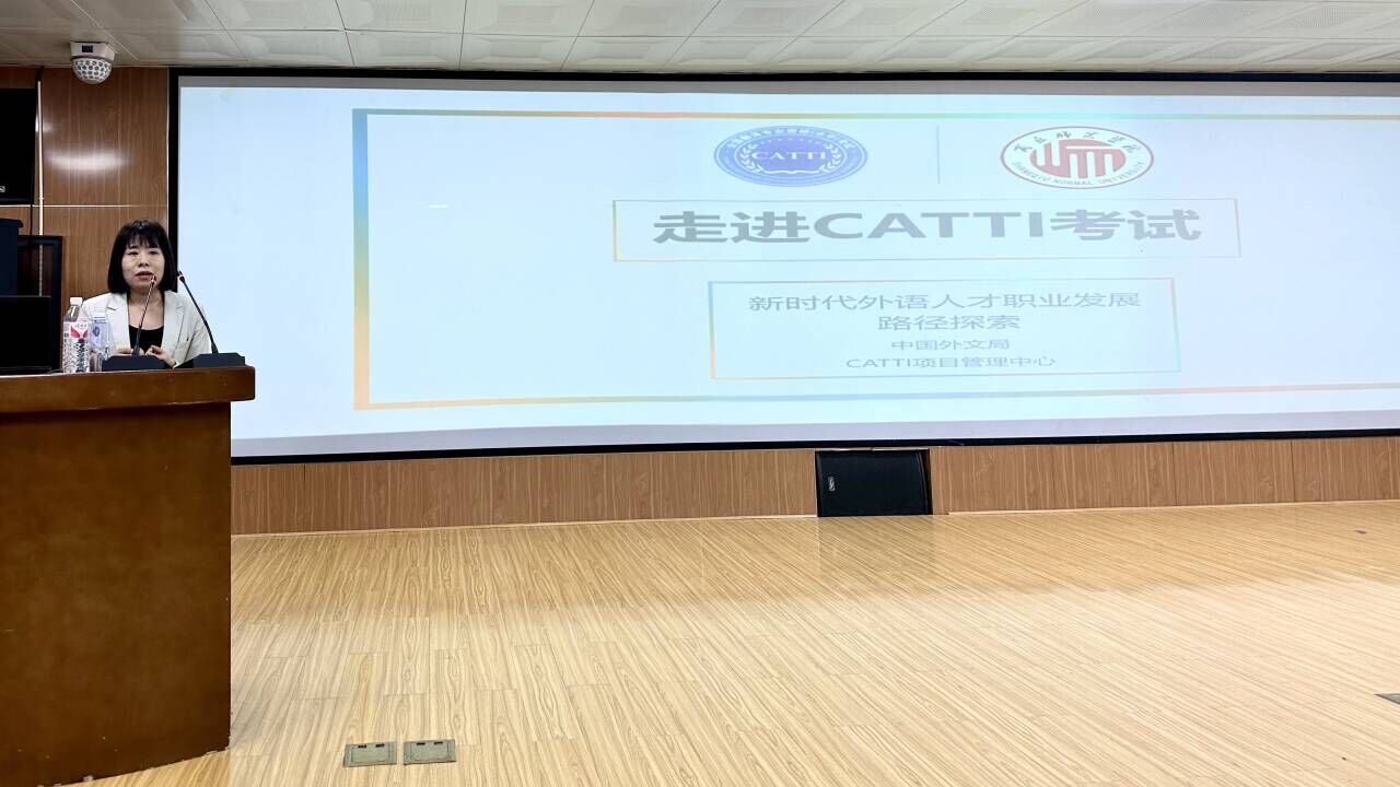 陈怡全以《走进 CATTI考试——新时代外语人才职业发展路径探索》为题,以生动的例子展示了新时代外语人才应具备的素养,详尽解释了CATTI 1-3级考试和国际版考试的题型、考试热点等问题,最后给同学们讲解了职业发展的前景,为同学们今后的学习、就业和职业发展指明了方向。