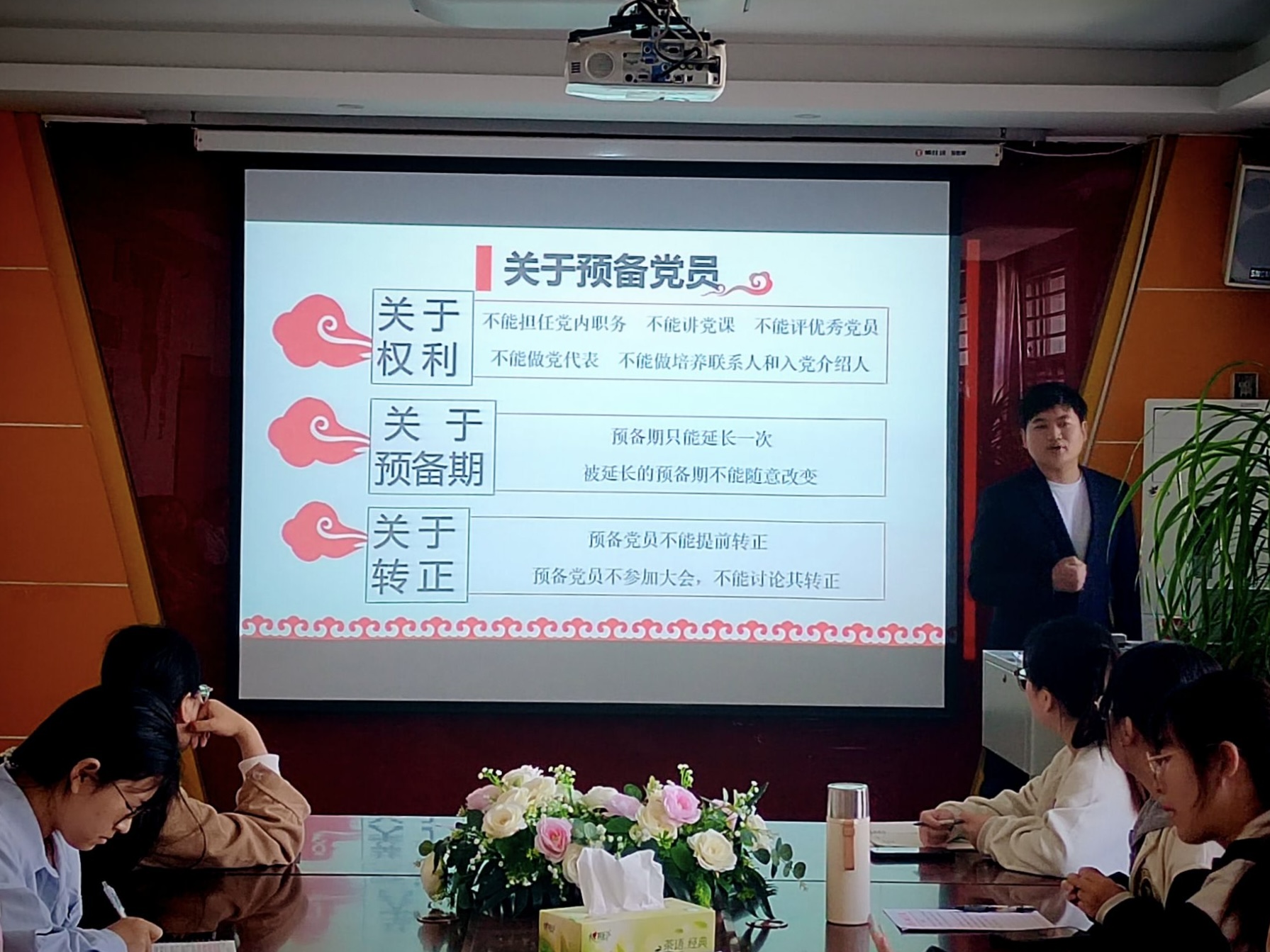 王贺乾从如何做好发展党员工作、发展党员的主要程序两个方面展开讲解,并结合工作实际为学员们进一步阐明发展党员的要求和标准,确保入党程序的严肃性和规范性。他还着重强调了发展党员工作的重要性,从思想层面加强对入党积极分子的教育,重点解读了发展党员的主要工作程序,从递交入党申请书,入党积极分子的确定培养,发展对象的确定考察到接收预备党员,再到预备党员的教育、考察和转正,让学员们对党员发展有了全面的了解。