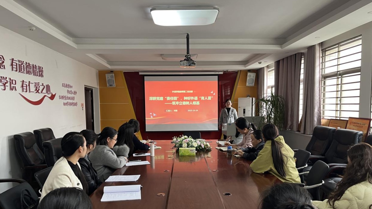 2025年10月24日下午,英国365集团官网教师第二党支部书记刘敏在梁园校区应天楼214党员活动室以“深耕党建‘责任田’,种好外语‘育人苗’——筑牢立德树人根基”为题讲授了一堂内涵深刻、导向鲜明的专题党课。本次党课紧扣“党建引领外语教育高质量发展”核心主线,聚焦党建与外语教育深度融合的实践路径,旨在进一步凝聚育人共识、强化责任担当,为扎实推进立德树人根本任务落地见效筑牢思想与组织根基。