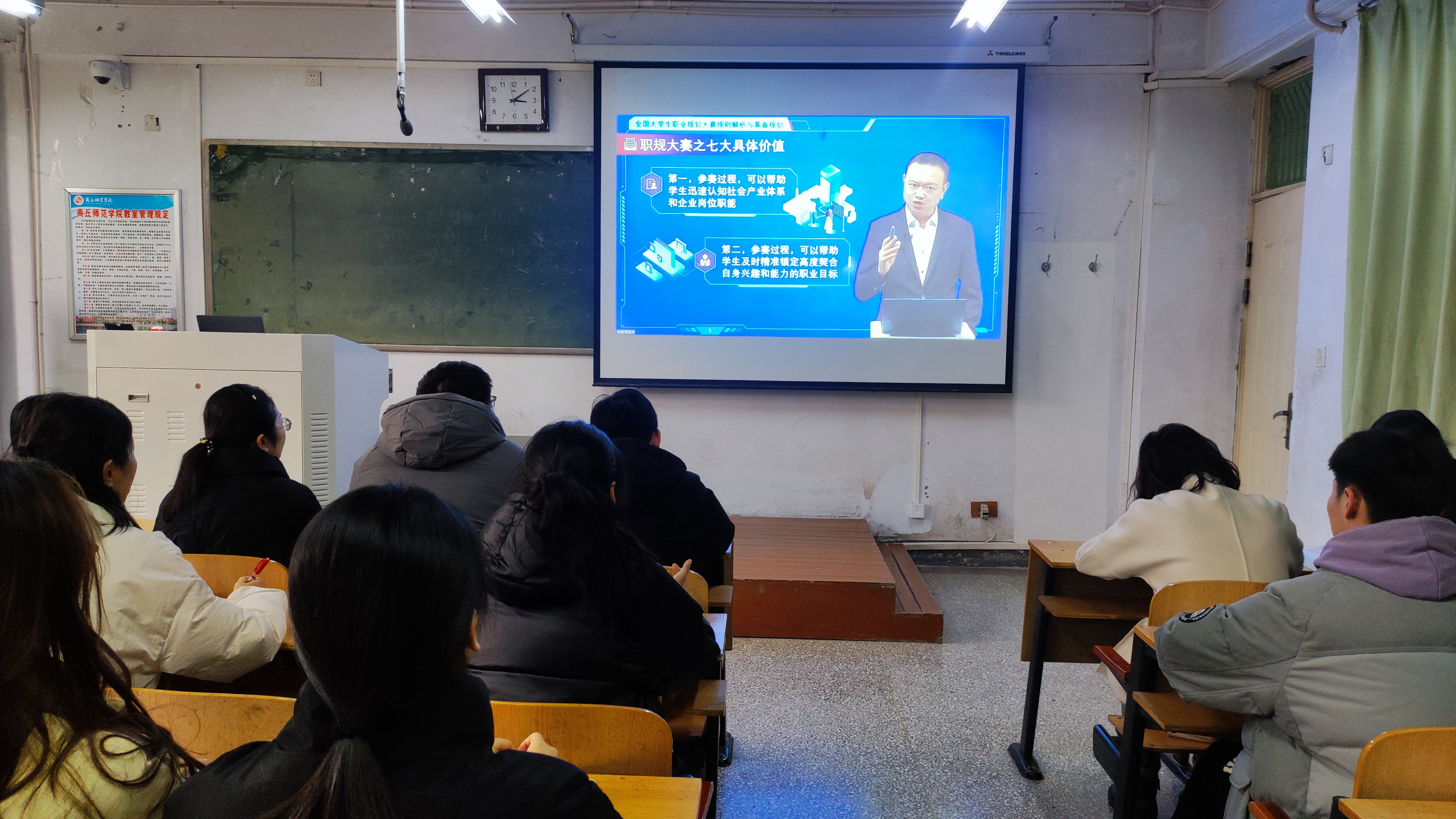 主讲嘉宾张锐对大赛核心目的与规则进行了解析,还对成长赛道和就业赛道的筹备规划进行了详细讲解。接着主讲嘉宾牛晋就成长赛道生涯发展报告展示逻辑及内容撰写,就业赛道求职简历与就业能力进行了解析。