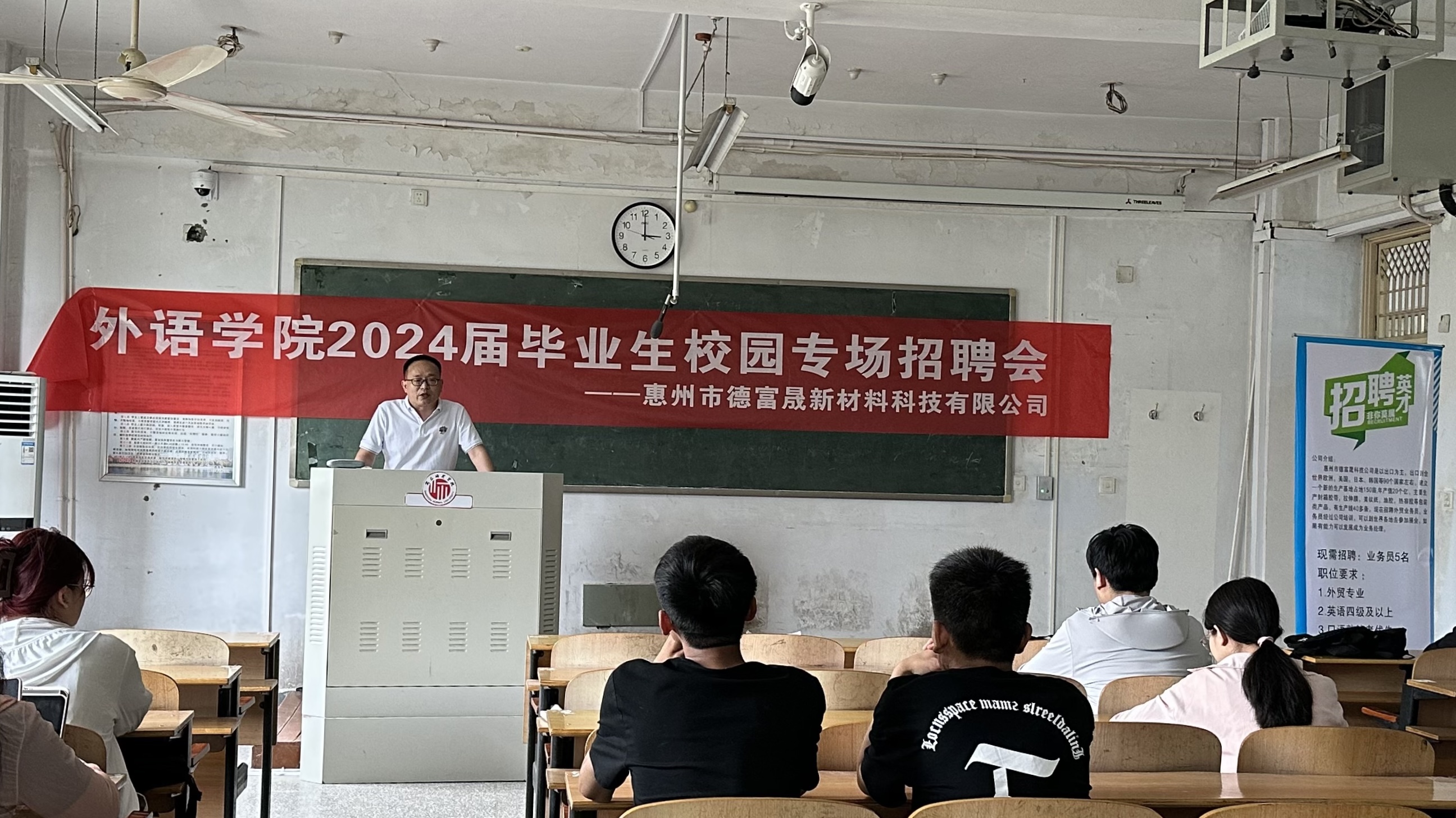 为进一步帮助“宏志助航计划”2024届毕业生和未就业毕业生顺利就业、尽早就业。5月30日下午,公司在智圆楼215教室举办了2024届毕业生校园专场招聘会——惠州市德富晟新材料科技有限公司专场招聘。英国365集团官网科级组织员王贺乾、辅导员丁佳硕和部分2024届毕业生参加了招聘会。