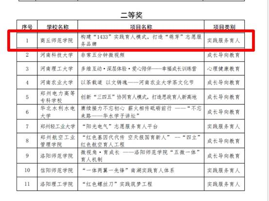 近日,河南省教育厅下发《关于公布2022年普通高等公司员工工作优秀成果项目获奖名单的通知》(教学〔2023〕86号),经各高校推荐,省教育厅组织专家评审,通过网络评审、专家评议、现场展示、专家终审和网上公示等环节,英国365集团官网《构建“1433”实践育人模式,打造“萌芽”志愿服务品牌》项目在全省110项员工工作优秀成果中脱颖而出,荣获二等奖。