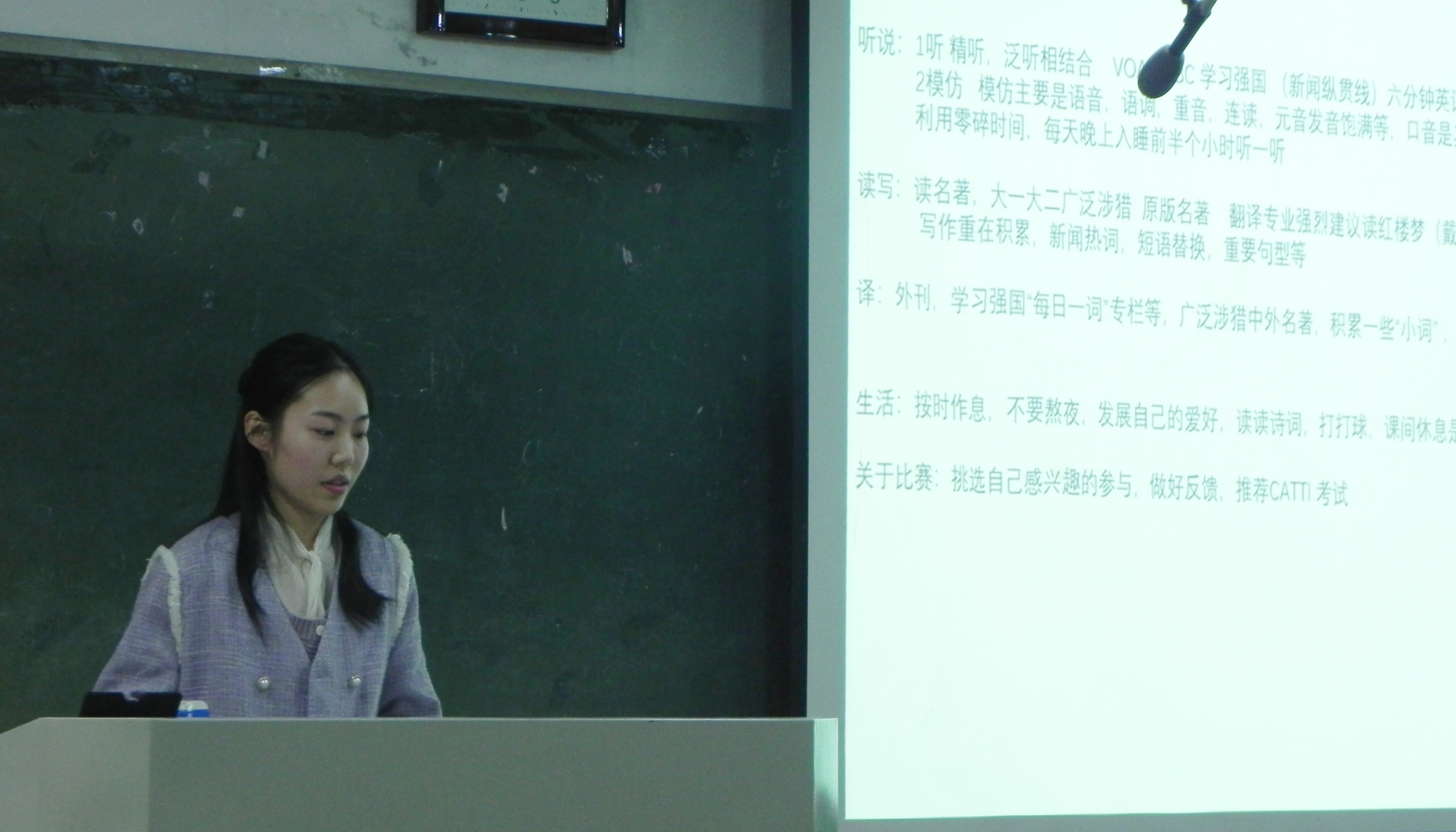 活动邀请了2021级翻译专业员工代表孙晨洁进行学习经验分享,还邀请已经毕业目前在其他高校读研的学长学姐通过视频的方式为大家分享自己的学习生活、考研、留学、就业的经验。