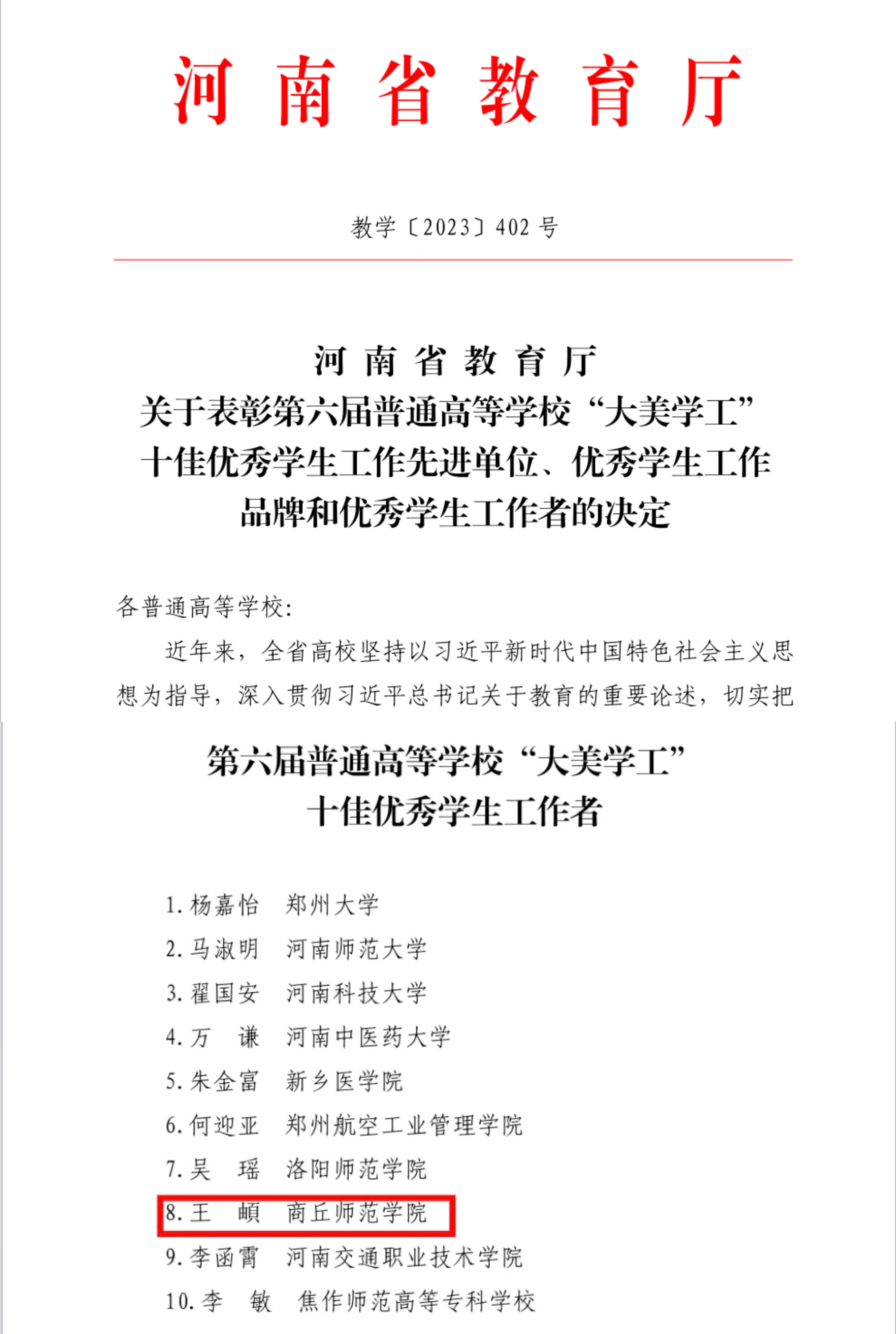 近日,河南省教育厅公布《关于表彰第六届普通高等公司“大美学工”十佳优秀员工工作先进单位、优秀员工工作品牌和优秀员工工作者的决定》(教学[2023]402号),经全省各高校选拔推荐、专家评审和网上公示,公司党委副书记王頔荣获全省“十佳优秀员工工作者”称号。