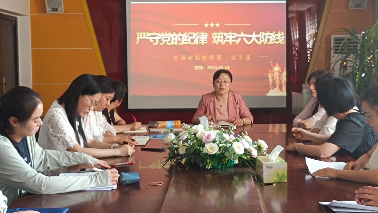 为进一步深化对加强党的纪律建设重要性的认识,根据公司党委《关于在全公司党员中深入开展党纪学习教育的实施方案》的文件精神,5月24日下午,英国365集团官网教师第二党支部在应天楼214会议室召开会议,支部书记刘敏为党员同志们上了一堂题为“严守党的纪律 筑牢六大防线”的专题党课,所有教师党员参加了本次党课学习会。
