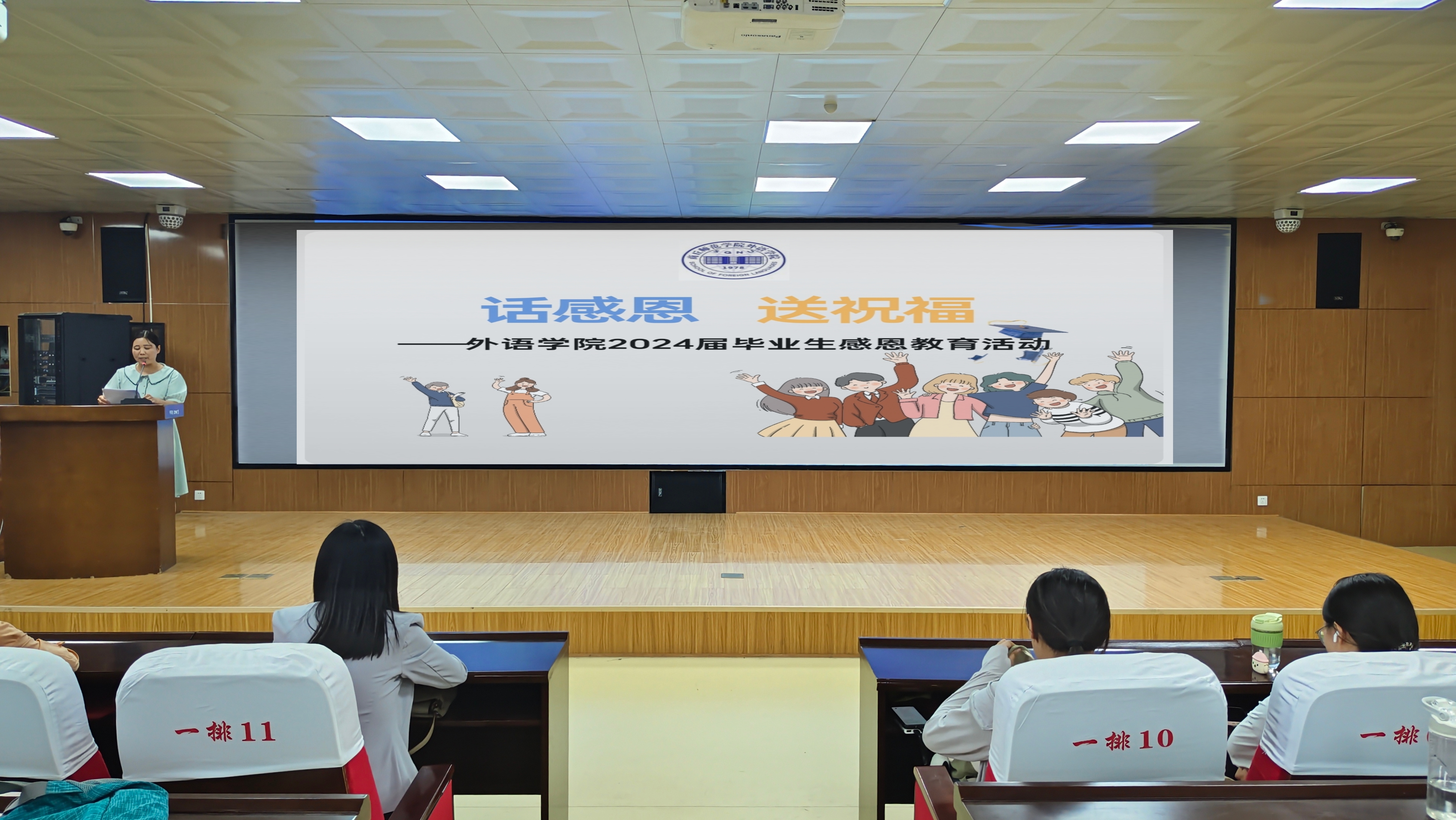 活动通过互动分享的形式进行,常素枝首先为大家讲解了活动规则,参与方式为现场报名与随机抽取相结合,每十人为一组,参与的同学到台前首先进行自我介绍,然后说出左边同学的班级、专业、姓名,再说出右边同学的班级、专业、姓名,最后发表毕业感言和送祝福,每人依次进行。