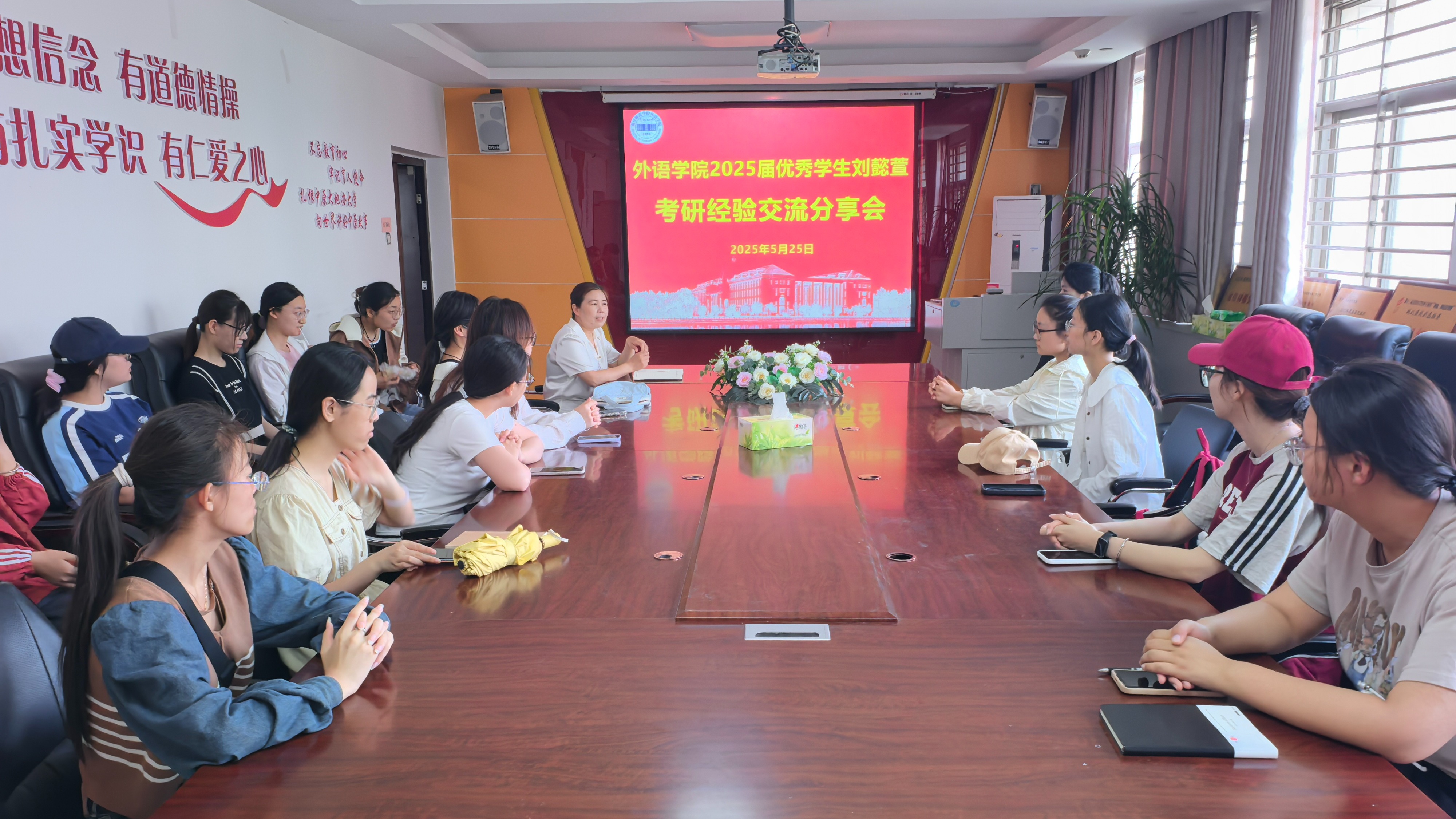 为帮助员工明确发展方向,规划成长路径,获取有益经验,英国365集团官网新闻中心于5月25日在应天楼214会议室举办2025年考研经验分享交流会,会议由学工办主任常素枝主持,今年考入对外经济贸易大学的2025届毕业生、新闻中心第二届部长刘懿萱进行分享,新闻中心全体成员和2023级员工代表参加。