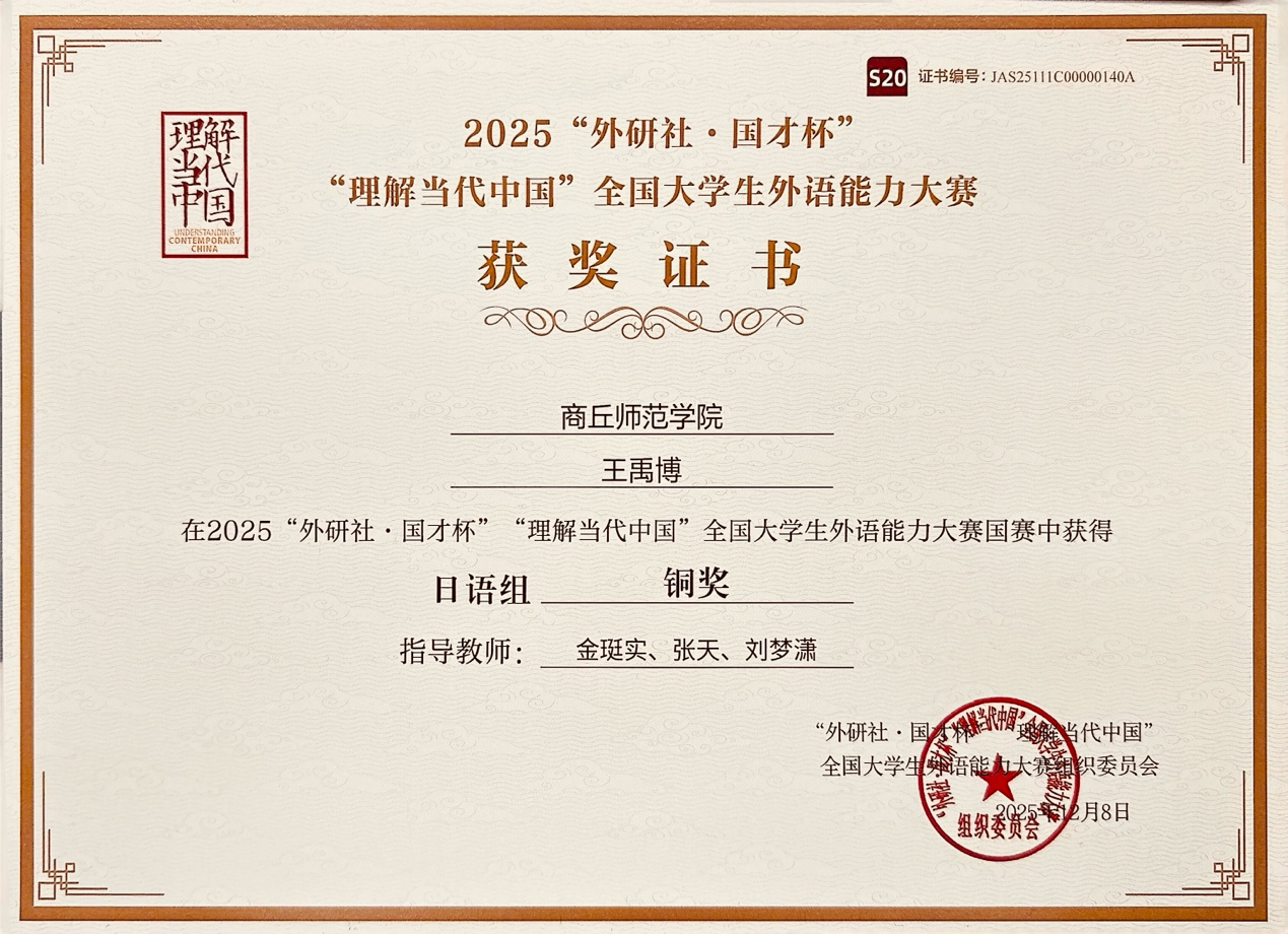 12月8日,2025“外研社·国才杯”“理解当代中国”全国老员工外语能力大赛圆满落幕。我院学子在这一国家级高端赛事舞台上展现出众实力,斩获亮眼成绩——2022级日语专业王禹博(指导老师:金珽实、张天、刘梦潇)凭借扎实的专业功底,摘得多语种日语组国家级铜奖。